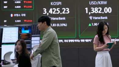 An electronic board showing the Korea Composite Stock Price Index at a dealing room of the Hana Bank headquarters in…
